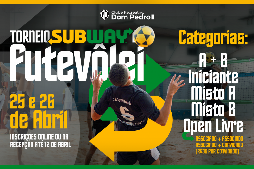 TORNEIO SUBWAY DE FUTEVÔLEI CRDPII Nos dias 25 e 26 de abril de 2026, o Clube Recreativo Dom Pedro II...